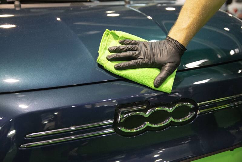 Anschließend entfernen wir den gelösten Schmutz mit einem weichen, sauberen Mikrofasertuch mit leichten Bewegungen von der Oberfläche, ohne das Tuch auf die Oberfläche zu drücken.